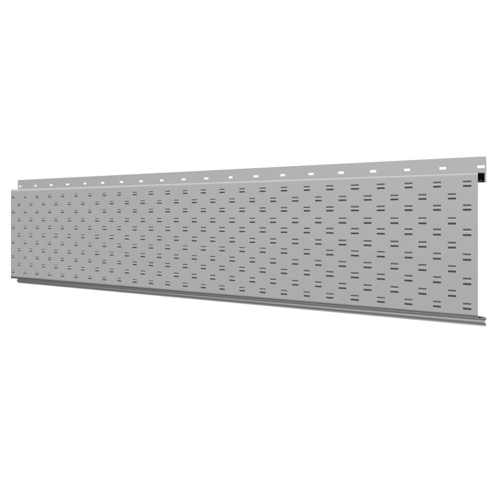 Линеарная потолочно-стеновая панель с ПЕРФОРАЦИЕЙ для вентиляции цвет RAL9006 Серебро применяется в качестве софитов для подшивы крыши, наружной и внутренней отделки потолков, стен, фронтонов фасада дома в Калуге.