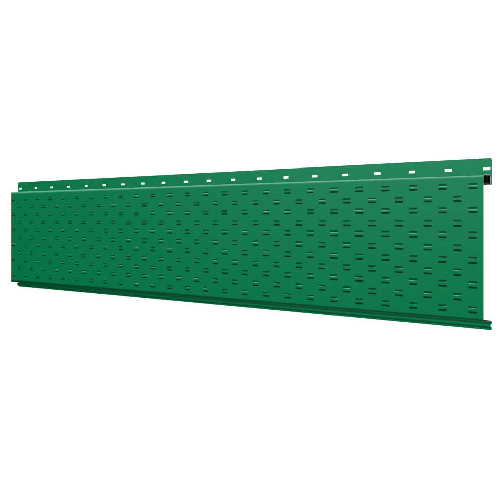 Линеарная потолочно-стеновая панель с ПЕРФОРАЦИЕЙ для вентиляции цвет RAL6029 Зеленая Мята применяется в качестве софитов для подшивы крыши, наружной и внутренней отделки потолков, стен, фронтонов фасада дома в Калуге.