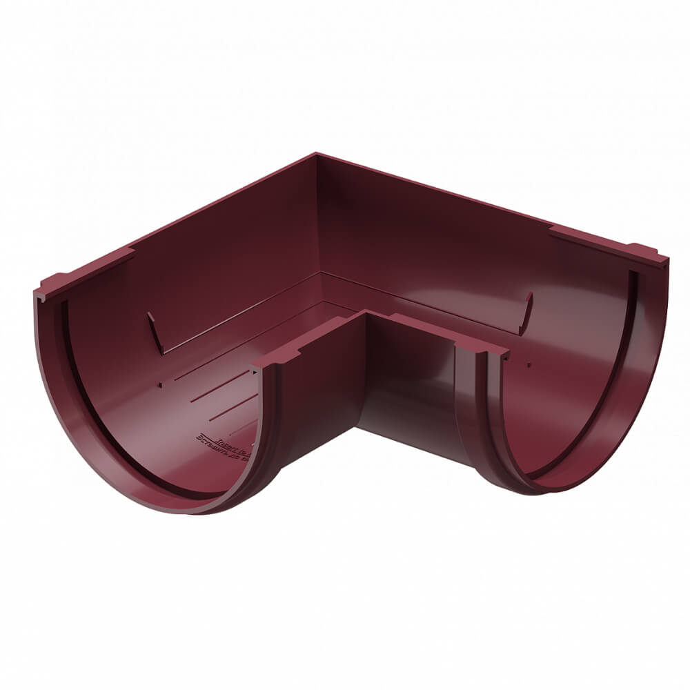 Угловой элемент желоба универсальный ДЕКЕ STANDARD d120мм 90 градусов цвет RAL 3005 Красный в Калуге. Угловые элементы устанавливаются как на внешних, так и на внутренних углах кровли и предназначены для соединения желобов.