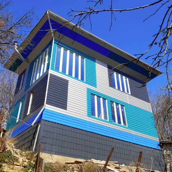 Дом «Перевертыш» — смелое сочетание архитектуры и цвета! Яркий небесно-голубой, глубокая морская волна, стильный графит и сияющее серебро в отделке фасада подчеркивают оригинальный характер постройки и создают впечатляющий современный облик. Металлический сайдинг Евро-Брус под брус не только придает дому выразительность, но и обеспечивает надежность и долговечность фасада. Такой дизайн вдохновляет на новое качество жизни — стильное, уверенное и по-настоящему индивидуальное.
