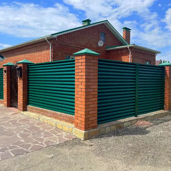 Забор-жалюзи с ламелями Еврожалюзи в стиле современного ландшафтного дизайна. Конструкция выполнена в изысканном оттенке RAL 6005 Зеленый мох, с односторонним покрытием полиэстер. Такой забор гармонично вписывается в зелёное окружение участка, создаёт приватность, при этом сохраняя лёгкость и воздушность пространства. Надёжный, стильный и практичный, он становится выразительным акцентом благоустройства территории.